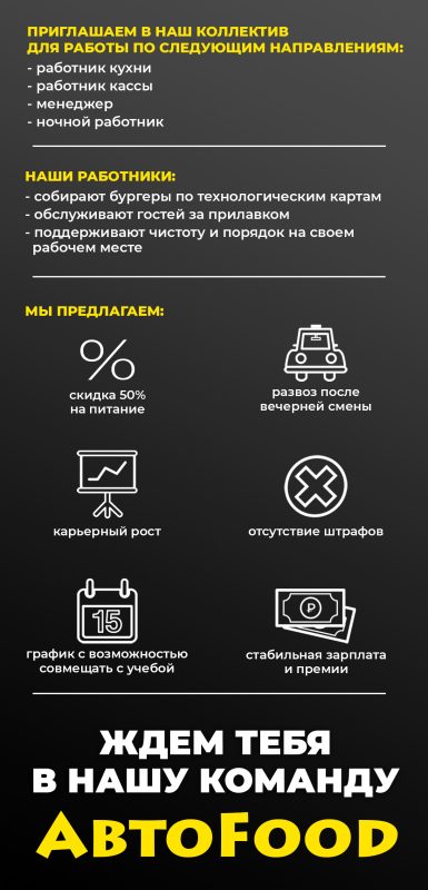 Наши сотрудники не продают бургеры, они представляют нашим гостям эмоции от посещения кафе «АВТОFOOD»!